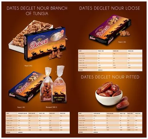 多尔卡斯国际贸易出口突尼斯日期"德格莱特努尔"DORCAS: - 日期 deglet nour 分支 Dorcas (包装 1 公斤和 500 克) , - 日期德格莱特努尔失去多尔卡斯 (包 1 公斤) , - 处理日期(包装 1 公斤) - 日期 deglet nour 处理 Dorcas 在 250 gr 和 500 gr. DORCAS国际贸易出口其他产品,即意大利面,香肠,芝麻,沙丁鱼罐头,番茄浓缩物,果汁,软饮料,饼干,果酱,橄榄油,婴儿尿布。 欲了解更多信息,请联系我们: 电子邮件